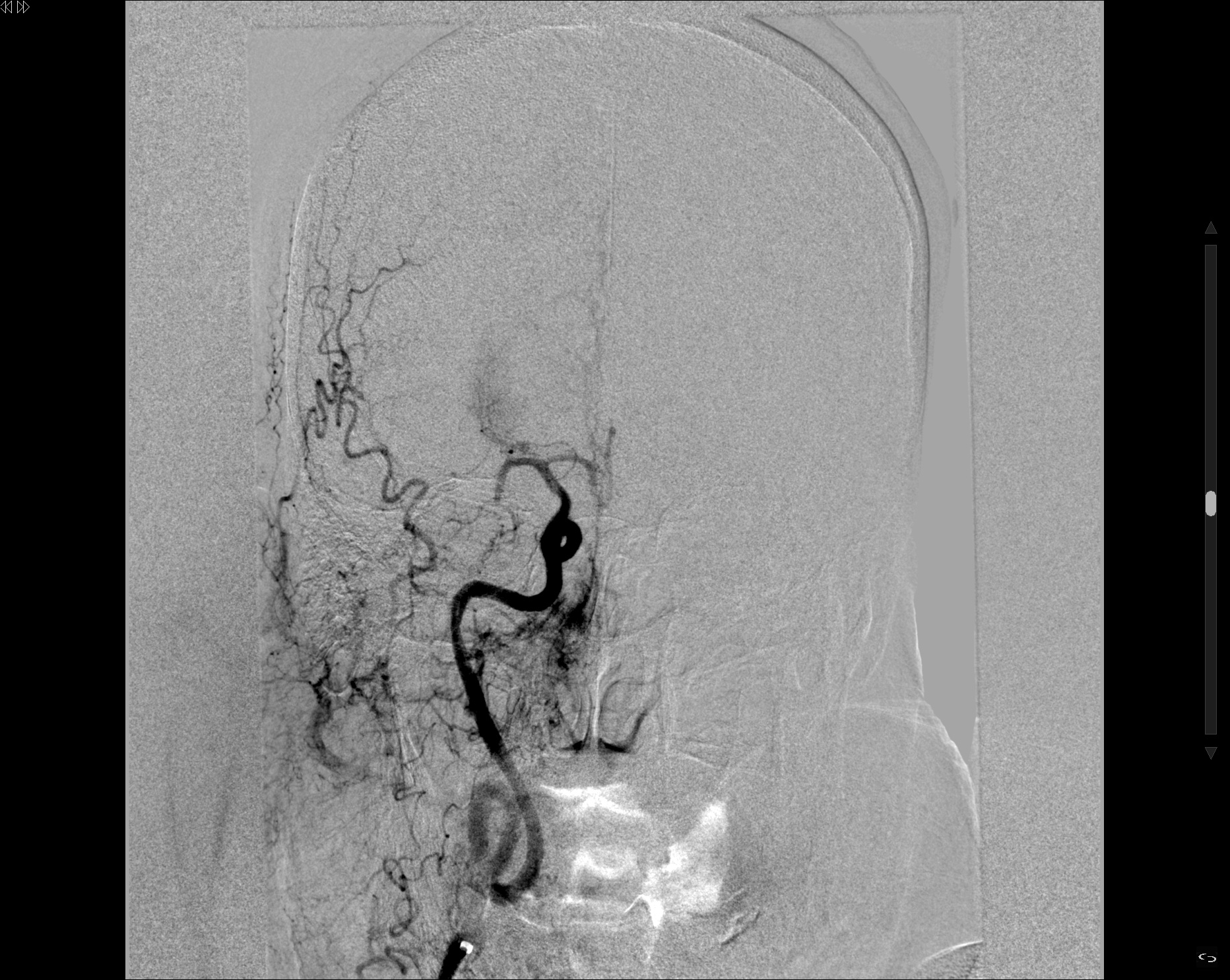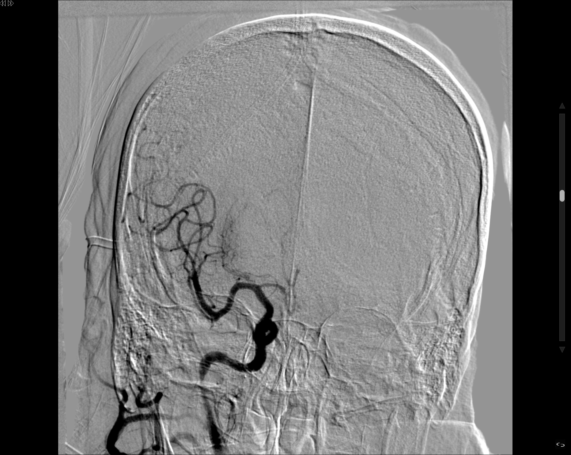repermeabilización distal. Oclusion de la A2 izquierda con repermeabilizacion distal. Resto de las principales arterias cerebrales intracraneales (ACM derecha, ACPs, Basilar, V4s) permeables