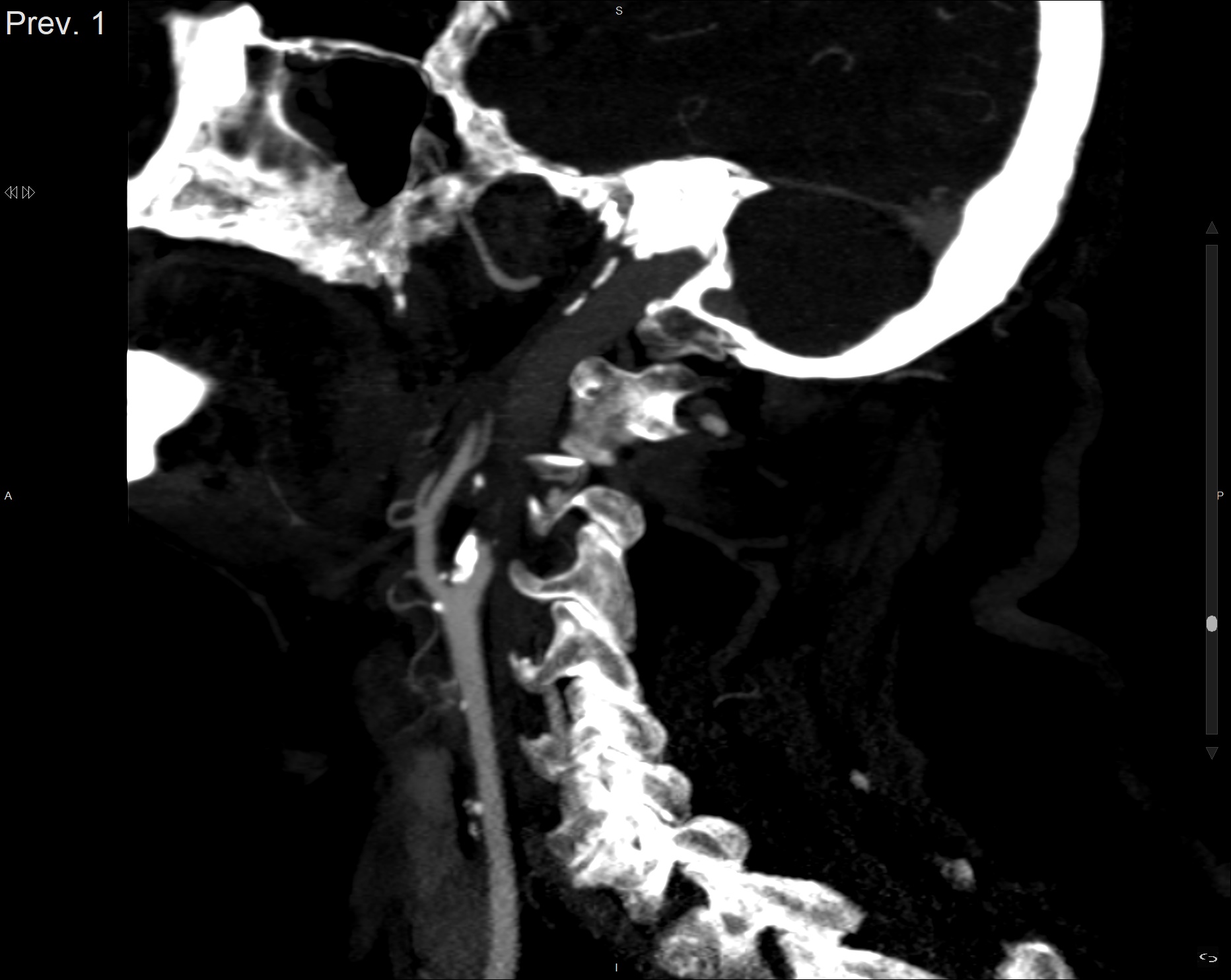 Aorta y segmentos proximales de troncos supraaórticos permeables con signos de ateromatosis no estenosante. Origen y segmentos cervicales de ambas arterias carótidas internas con ateromatosis, causando una oclusión total de la derecha y una estenosis >80-90% de la izquierda. Origen y segmentos cervicales de las arterias vertebrales permeables con signos de ateromatosis no estenosante.