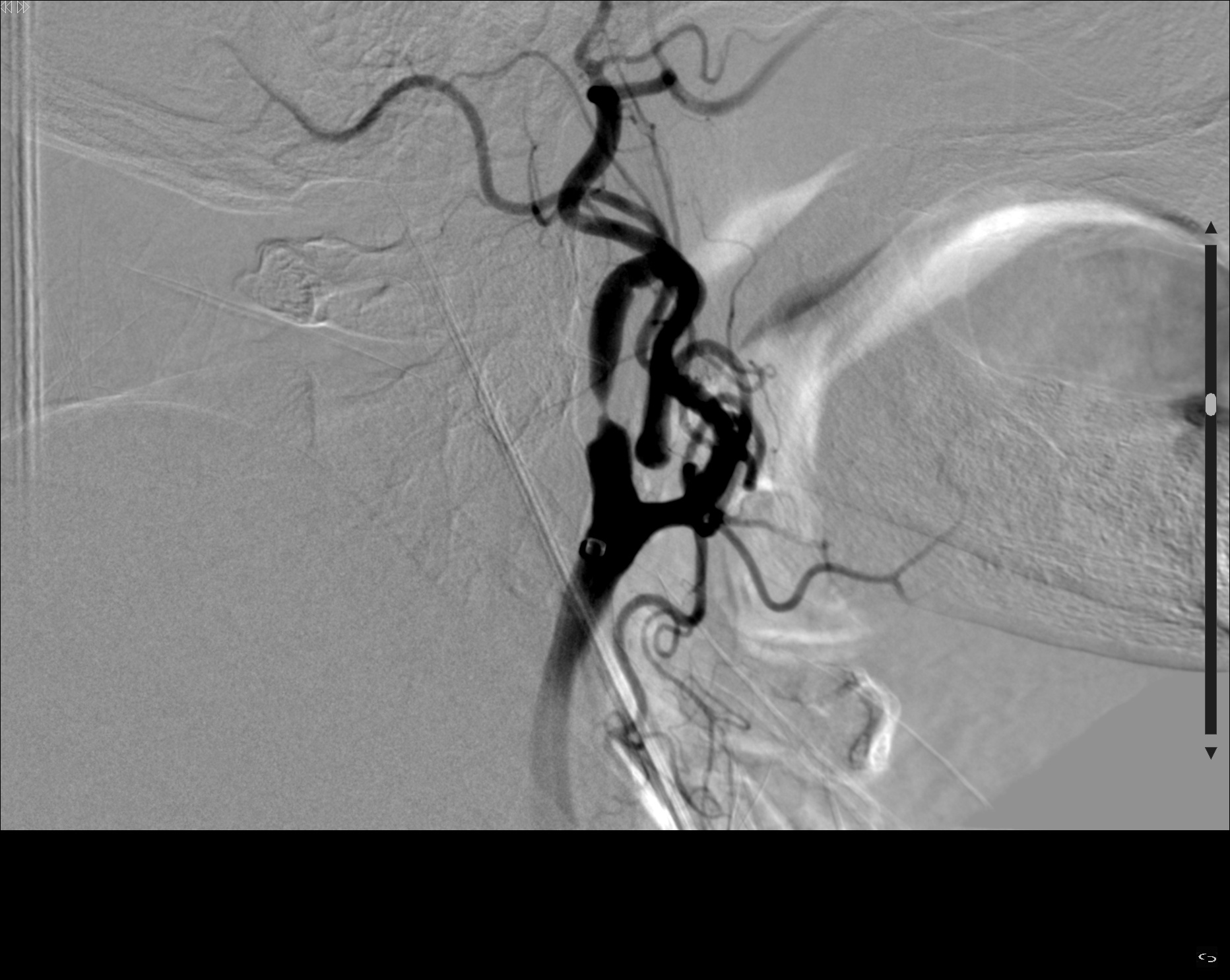 Se realiza punción femoral derecha. Se realiza cateterización selectiva de la arteria carótida común izquierda derecha y la primera serie angiográfica pone de manifiesto una estenosis mayor del 80% secundario a placa irregular ulcerada en el origen de la ACID. Se atraviesa