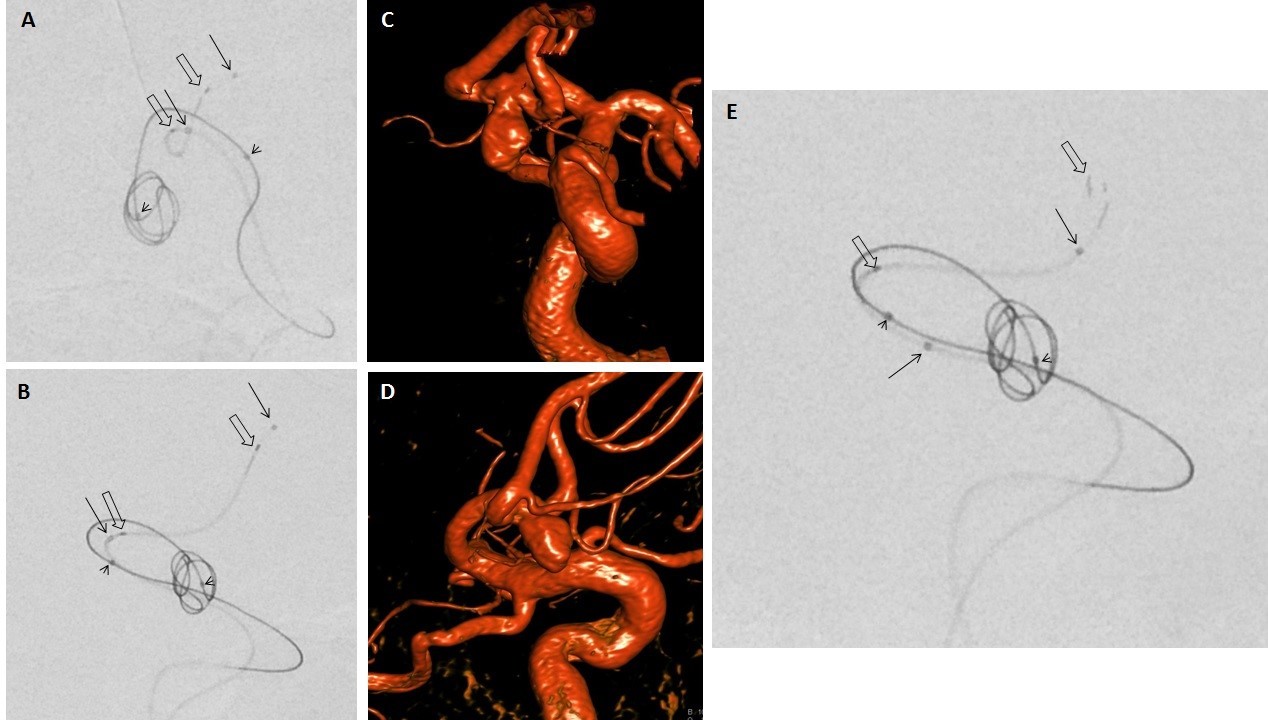Imagen 3: Capturas de fluoroscopia sustraída (A y B) y sus correspondencia en reconstrucción 3D (C y D respectivamente) que muestran la proyección desde la que se procede a liberar el stent en segmento A2 de la ACA izquierda. Se pueden apreciar la posición de las dos marcas del microcatéter de liberación de stent (flechas finas largas), las dos marcas del stent  (flechas huecas) y las marcas del microcatéter de embolización (cabezas de flecha) con coil largo parcialmente desplegado en el saco aneurismático.  En la imagen E se observa el inicio de la liberación del stent con las patillas distales abiertas (flechas huecas).