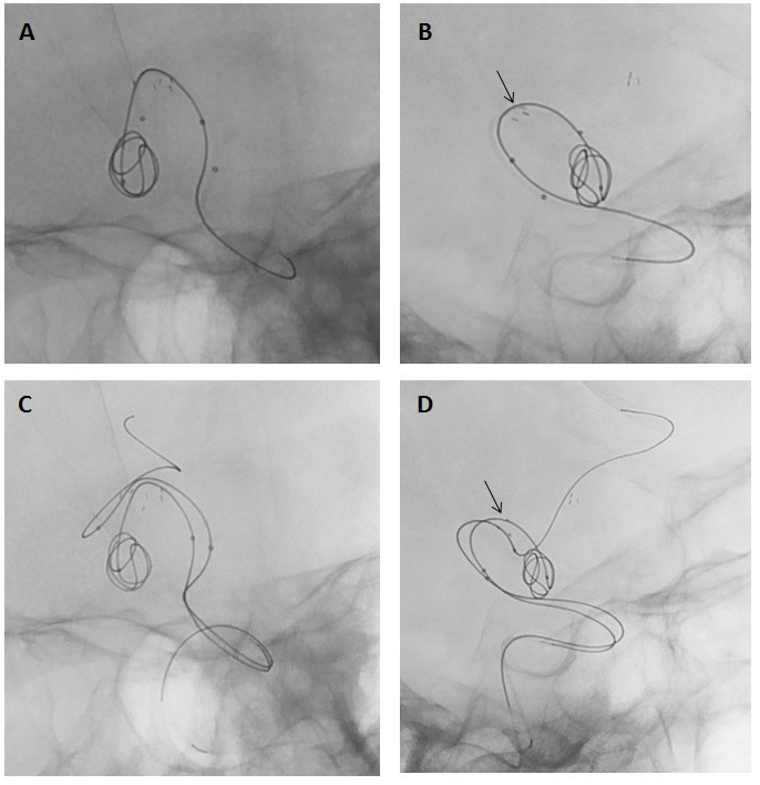 Imagen 4: Proyecciones anteroposterior y lateral oblicuas en nativo de fluoroscopia tras la liberación del stent (A y B) y tras el intento de microcateterización del segmento A2 derecho para “stenting en Y” (C y D). Obsérvese el acortamiento del extremo proximal del stent (flechas)  tras intentar atravesar el mismo con el microcatéter.