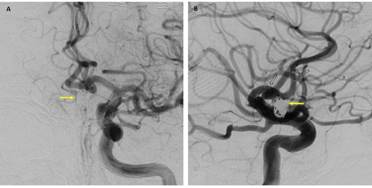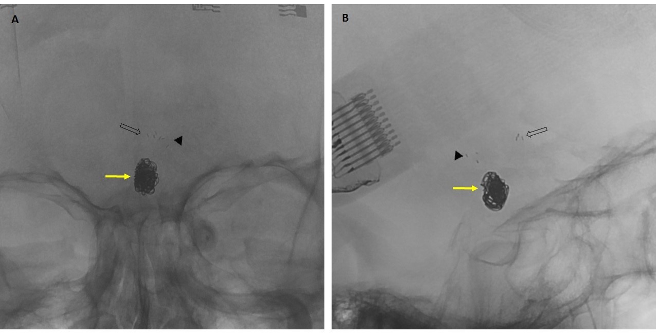 Imagen 5: Capturas de fluoroscopia en nativo sin contraste intravenoso en proyecciones AP (imagen A) y lateral de cráneo (imagen B) que muestran resultado final de saco aneurismático relleno de coils (flecha amarilla) y posición respectiva del stent (flecha hueca indica patillas distales y cabeza de flecha las proximales).