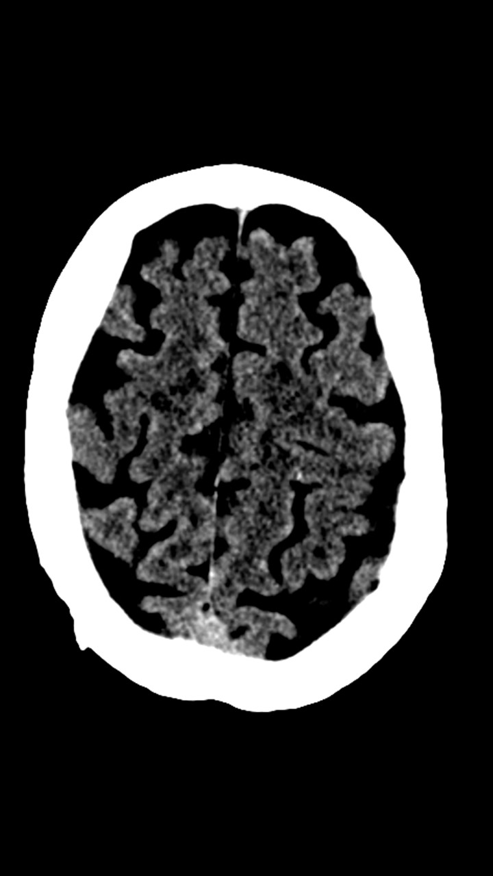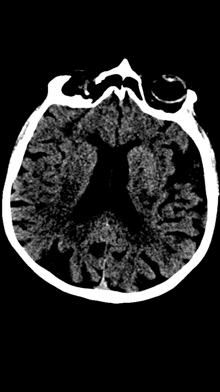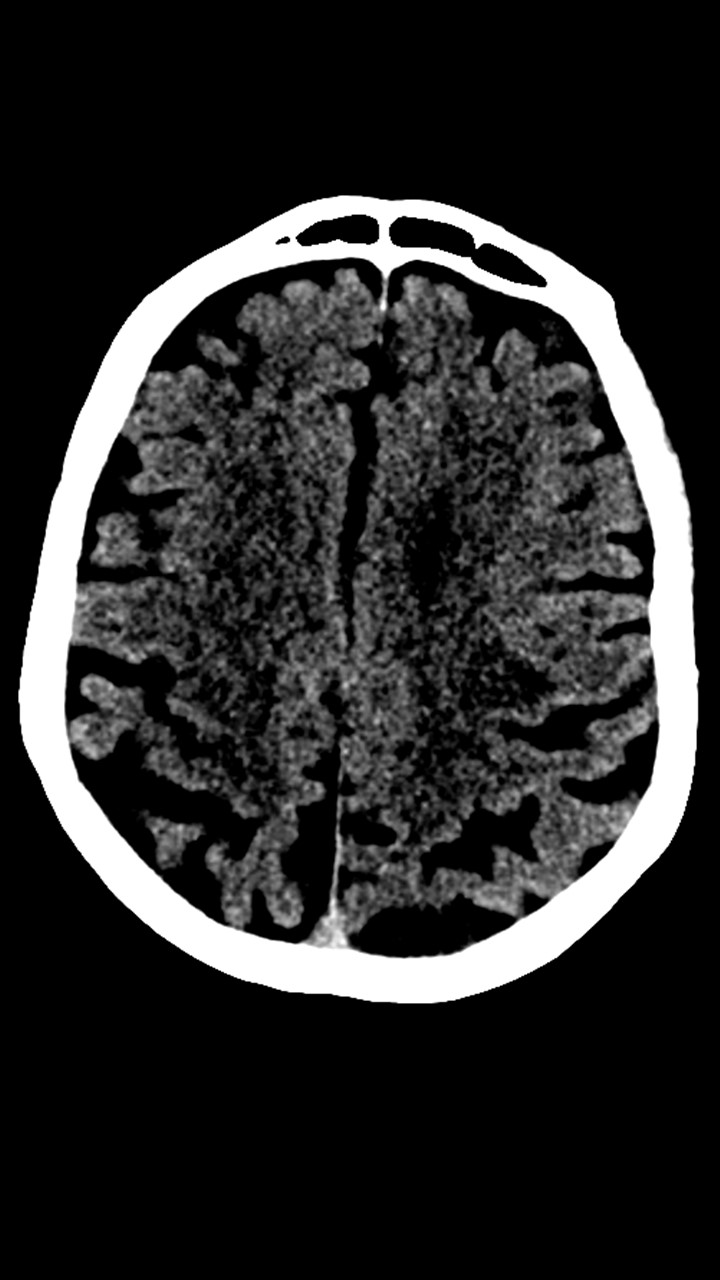 Vasos del polígono sin claros signos de oclusion. No se aprecian alteraciones de la densidad del parénquima cerebral. No se aprecian signos de sangrado. tamaño ventricular y cisternas de la base sin alteraciones.