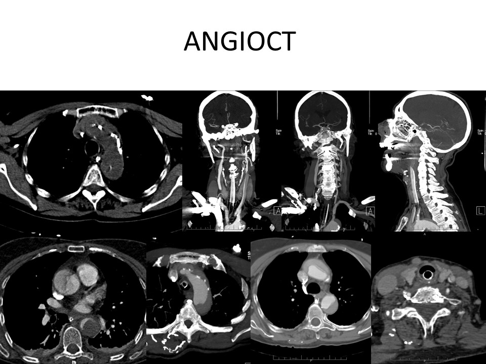 La disección se extiende por ambas carótidas hasta tercio medio de la común derecha y carótida común pre-bifurcación izda. Carótidas externas e interna derecha permeables. La luz de la carótida interna izquierda se origina de la luz falsa y presenta una menor repleción de contraste en relación a la carótida contralateral.