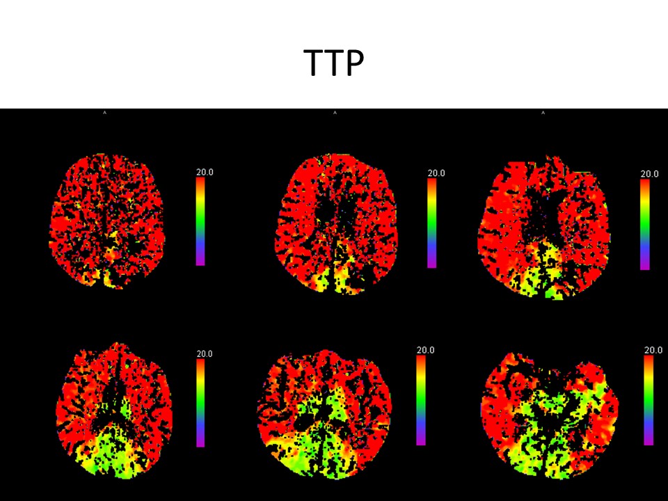 Un extenso territorio de retraso en mapas de tiempo a nivel de la totalidad del territorio de ambas carótidas con relativa área respetada a nivel de la circulación posterior.